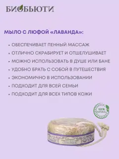 Мыло с люфой прекрасно подходит для глубокого очищения кожи и пор, обеспечивает пенный массаж. Люфа хорошо отшелушивает ороговевшие клетки кожи, не нанося ей вреда. Благодаря этому кожа становится мягкой, нежной и бархатистой. Чувственный аромат лаванды помогает снять напряжение и усталость, приводит в состояние умиротворения и покоя, довершая процесс купания своеобразной ароматерапией. Мыло на веревке удобно использовать в душе или бане, а также брать с собой в путешествия. Экономично в использовании. Подходит для всех типов кожи, в том числе и для чувствительной. Срок хранения 12 месяцев