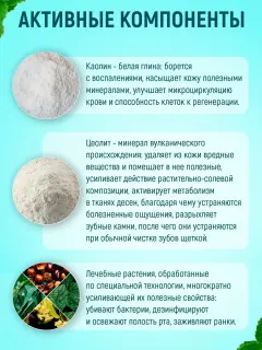 В его состав входят полезные травы и растения, измельченные по особой технологии. Лечебное действие компонентов сохраняет цеолит, он способствует проникновению полезных витаминов, микро- и макроэлементов глубоко в ткани. Букет трав и растений в составе порошка оказывает заживляющее действие, убивает бактерии и устраняет воспаления. Белая глина активно очищает от налета, а морская соль предотвращает развитие пародонтоза.