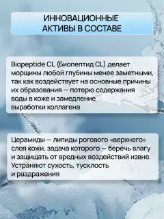 увеличивает производство собственного коллагена на 350%, а гиалуроновой кислоты на 146%. Комплекс аминокислот, витаминов и микроэлементов максимально глубоко питают кожу, стимулируют процессы регенерации и обновления, возвращают выработку коллагена на оптимальный уровень. Через 1-2 недели применения лицо заметно омолаживается, повышается упругость и эластичность кожи, исчезают мелкие недостатки и признаки усталости. Крем может использоваться как дневной, под макияж, а также как ночной, восстанавливающий кожу во время сна. Эффект от применения: обеспечивает полноценное питание коже, стимулирует процессы регенерации и обновления, препятствует деградации коллагена; оказывает антиоксидантное действие, помогает выровнять пигментацию, защищает от фотостарения; улучшает синтез липидов и барьерной функции; стимулирует процессы обновления во всех слоях кожи, замедляя процессы естественного увядания. Перед применением сделайте проверку на наличие аллергических реакции на локтевом сгибе. Стабилизатор микробиологической чистоты(консервант): Euxyl К 900 (0,5%), разрешенный ECOCERT ингредиент. Не тестируется на животных. Более 98% натуральных ингредиентов в составе. Срок хранения крема в заводской упаковке - 18 месяцев. После вскрытия хранить в холодильнике. Срок хранения с момента вскрытия – 6 месяцев.