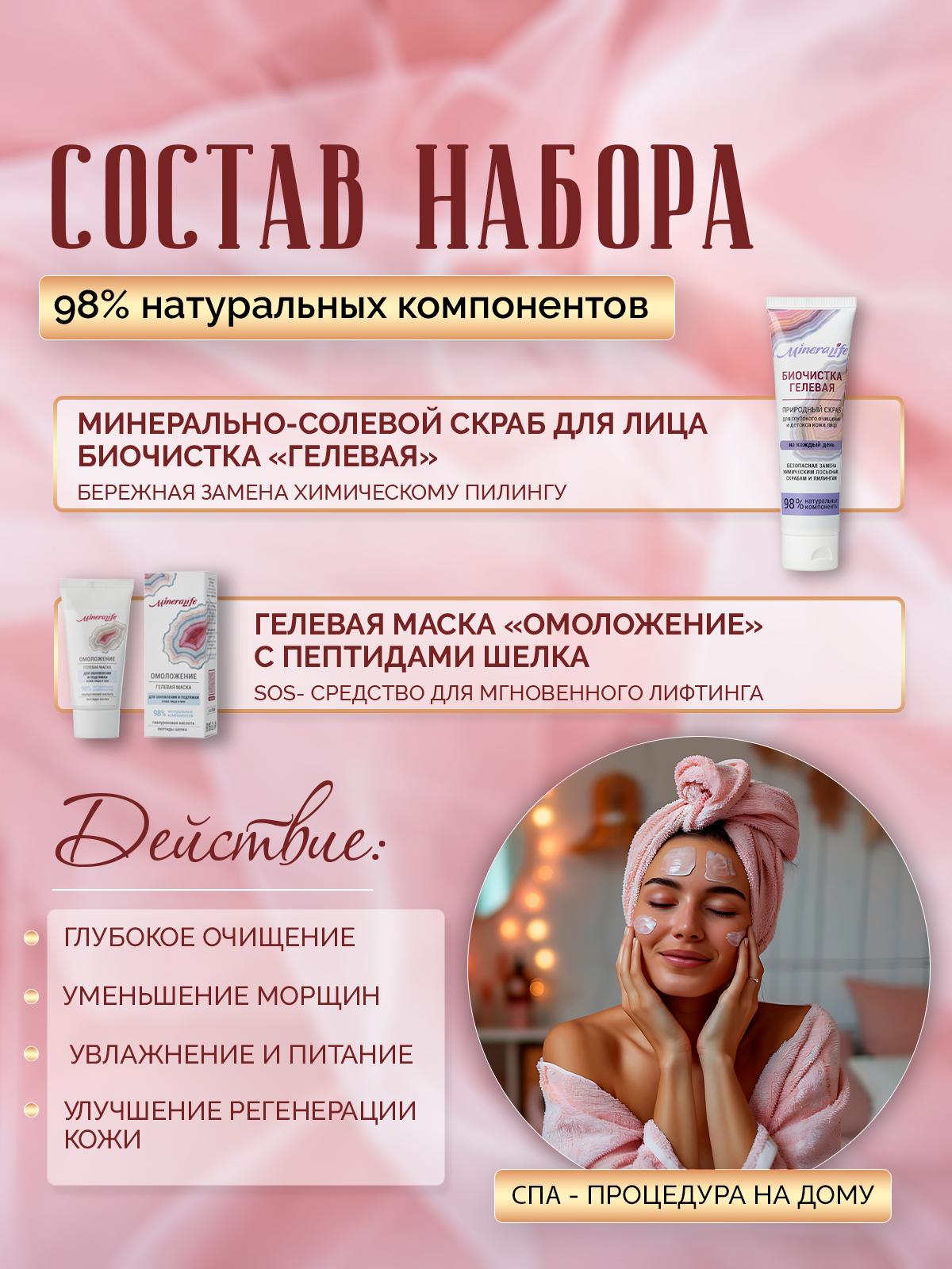 В наборе «Натуральное омоложение» собраны средства, которые не оставят равнодушной любую женщину. Да и красивая деревянная коробочка приглянется многим. Первое средство — это Биочистка Гелевая Mineralife, потому что первым делом по уходу за кожей лица идет правильная очистка. Именно нежнейший скраб Биочистка Гелевая Mineralife позволит деликатно очистить кожу любого типа. Мощный адсорбент цеолит, входящий в состав средства, за счет своих природных свойств как пылесос убирает из кожи различные загрязнения и проводит ее детоксикацию. Одно применение обеспечивает глубокое очищение кожи всего за 1 минуту и в результате удаляются загрязнения, которые накопились в эпидермисе за целый месяц. Прекрасно, что у Биочистки есть еще и антивозрастной эффект: при регулярном использовании замедляется старение клеток и уменьшается видимость морщин. Важно,что после умывания этим средством многократно увеличивается эффект от применения масок и кремов. Второе средство — это Гелевая маска «Омоложение» Mineralife с гиалуроновой кислотой для обновления и подтяжки кожи век и лица. Если вы нанесете эту маску сразу же после умывания Биочисткой, то многократно увеличите эффект. Маска тормозит появление признаков преждевременного увядания кожи и отлично подтягивает ее. Если ваша кожа сухая, то эта процедура существенно увлажняет ее и помогает остановить потерю влаги. Поможет маска и с устранением мешков под глазами и с улучшением рельефности овала лица, т.к. она оказывает выраженное дренажное действие и усиливает отток лимфы. Ваших подарков ждут и женщины и мужчины. Создайте волшебную атмосферу с подарочными наборами от БиоБьюти ко дню рождения, выпускному или свадьбе!