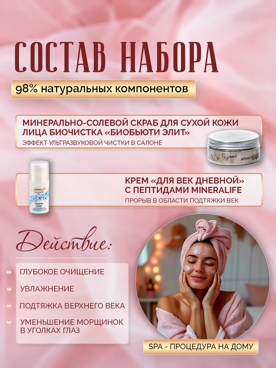Подарочный набор «Природное омоложение» в деревянном коробе порадует 100% натуральный скрабом премиум-качества — Биочисткой серебряной «БиоБьюти-Элит» для сухой и нормальной кожи. Эффект от его применения сравним с эффектом от ультразвуковой чистки в салоне. Он обогащен ионами меди, цинка и серебра, которые помогают в борьбе с признаками старения и пигментации. При регулярном применении этого чудесного эксфолианта нормализуется водный баланс кожи и уходят шелушения и раздражения. Применив это средство, значительно усилится эффективность дальнейшего ухода(кремов и масок). И еще один продукт премиум-качества, который приготовлен в этом наборе — это Крем для век «Дневной» Mineralife. Это легкий крем для век с экстрактом зеленого чая, инновационными активами и гиалуроновой кислотой. Он подтягивает верхнее веко и разглаживает морщинки в уголках глаз. С его помощью уменьшается отечность и устраняются темные круги под глазами. И конечно же, крем стимулирует синтез гиалуроновой кислоты — очень важный компонент нашей кожи, который отвечает за молодость и красоту. В результате кожа вокруг глаз становится увлажненной, гладкой и эластичной, что сразу дает омолаживающий эффект всего лица. Крем также подойдет и как основа под макияж. Вот такой подарок вы можете подарить на день рождения. свадьбу или выпускной своим друзьям и подругам. Он подойдет как женщинам, так и мужчинам, которые хотят выглядеть моложе и красивее. Дарите радость в виде подарков, и она вернется вам с благодарностью от удовольствия при использовании косметики БиоБьюти. А мы постараемся вас не подвести.