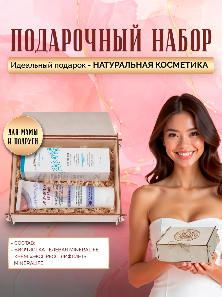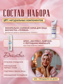 Когда вы увидите необычную деревянную коробочку, обязательно ее откройте. Внутри вы найдете необычное содержимое — новогодний набор «Эффективное омоложение», который состоит из двух удивительных натуральных средств, направленных на омоложение вашей кожи. Они дают быстрый антивозрастной эффект и делают кожу действительно молодой и красивой. Первый шаг — очистка кожи лица. Для этого мы предлагаем использовать нежнейший Скраб Биочистку Гелевую Mineralife — она предназначена для деликатного очищения кожи любого типа. Всего за 1 минуту Биочистка удаляет загрязнения, которые накопились в эпидермисе за целый месяц, делая кожу свежей и сияющей, а также она обладает антивозрастным эффектом — замедляет старение клеток и уменьшает видимость морщин. Кроме того, данный скраб устраняет мешки под глазами и следы недосыпа. Второй шаг— нанесение омолаживающего крема «Экспресс-лифтинг» Mineralife. Этот крем с пептидами мгновенного действия и янтарной кислотой создан специально для профилактики гравитационного птоза кожи и мгновенного лифтинга. Новейшие антивозрастные активы в составе продукта способствуют созданию легкого каркаса в виде дышащей пленки, за счет чего становится более четким овал лица и уменьшаются носогубные складки. В комплексе эти два средства окажут отличное омолаживающее воздействие: вы заметите как лицо станет выглядеть более подтянутым, повысится упругость кожи и даже приподнимутся уголки век. Этот подарочнвый набор прекрасно пойдет ко дню рождения, свадьбе, 8 марта и другим праздникам и создаст праздничное настроение женщинам или девушкам, которые любят доставлять удовольствие своей коже.