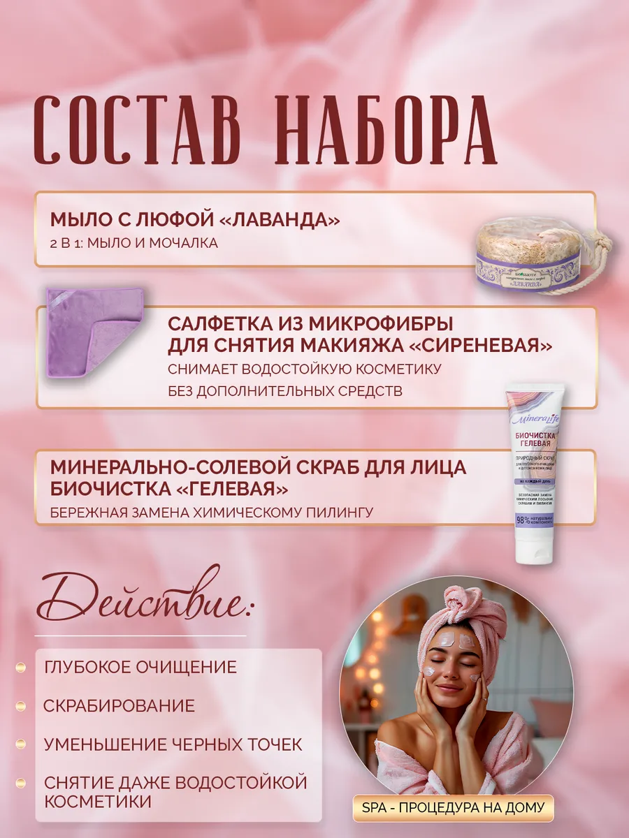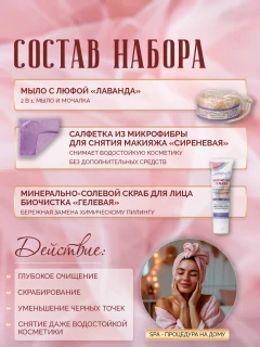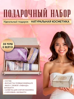 «Лавандовая гармония». Этот новогодний набор в деревянном коробе для ценителей лавандовых ароматов, сиреневых оттенков и душевного равновесия. Именно для них создано Мыло с люфой «Лаванда» с натуральным эфирным маслом лаванды. Чувственный аромат лаванды помогает снять напряжение и усталость, приводит в состояние умиротворения и покоя, довершая процесс купания своеобразной ароматерапией. А еще мыло с люфой прекрасно подходит для глубокого очищения кожи и пор, обеспечивает пенный массаж. Люфа хорошо отшелушивает ороговевшие клетки кожи, не нанося ей вреда, благодаря чему кожа становится мягкой, нежной и бархатистой. Здесь же в наборе найдется и Салфетка косметическая для умывания и снятия макияжа в сиреневом тоне, которая прекрасно подойдет для тех, кто устал от постоянных затрат на мицеллярную воду, молочко для снятия макияжа и тысячи ватных дисков. Ее поверхность из микроволокна притягивает грязь и удаляет не только излишки кожного жира, но и макияж (даже водостойкую тушь и помаду) и отмершие чешуйки кожи, подготавливая кожу к дальнейшему уходу. Как приятно снимать косметику нежнейшей салфеткой, которая настолько мягкая, что к ней хочется прижаться и понежиться. А теперь очередь нежного скраба Биочистки Гелевой Mineralife, которая предназначена для деликатного очищения кожи любого типа. Всего за 1 минуту Биочистка удаляет загрязнения, которые накопились в эпидермисе за целый месяц, делая кожу свежей и сияющей, а также она обладает антивозрастным эффектом — замедляет старение клеток и уменьшает видимость морщин. Этот набор подойдет женщинам или девушкам любящим все натуральное и необычное. Подарочные наборы на день рождения, свадьбу, 8 марта и другие праздники от БиоБьюти порадуют и вас, и тех, кому вы их подарите.