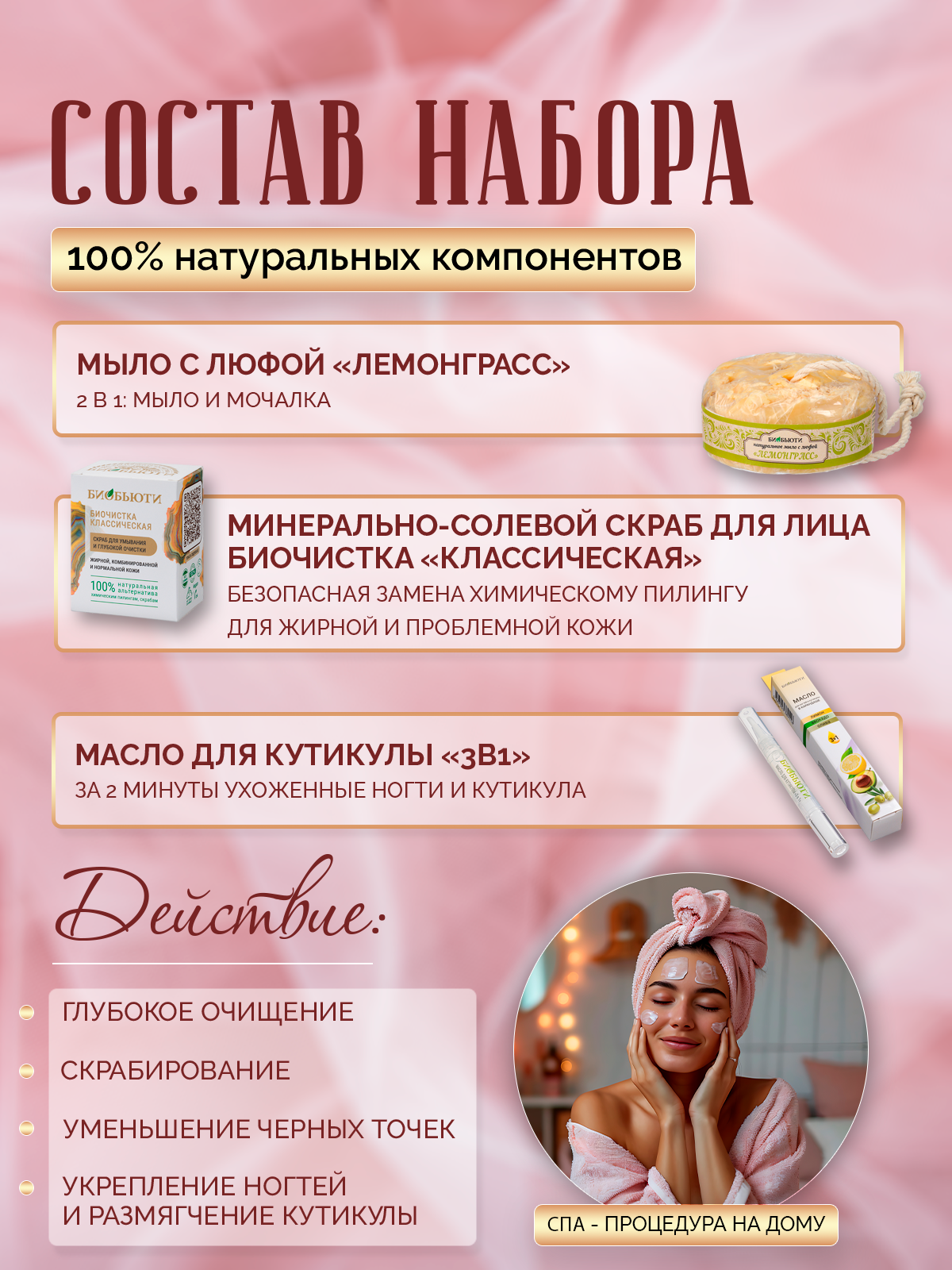 Открыв этот подарочный новогодний деревянный короб, вы насладитесь приятными нотками афродизиака лемонграсса. Все дело в натуральном ароматном мыле с люфой «Лемонграсс». Это мыло прекрасно подходит для глубокого очищения кожи и пор, обеспечивает пенный массаж. Оно отшелушивает ороговевшие клетки, благодаря чему кожа становится мягкой, нежной и бархатистой. Обогащенное эфирным маслом лемонграсса, известного своим тонизирующим действием, мыло с люфой делает кожу более упругой и помогает улучшить её состояние в проблемных местах. Еще в наборе вы найдете Биочистку БиоБьюти «Классическую» — идеальный скраб для ухода за нормальной и жирной кожей. Это косметическое средство состоит из натуральных компонентов. Биочистка очищает поры, устраняет загрязнения и жирный блеск и улучшает цвет лица. Очень важно, что она осуществляет пилинг лица, не повреждая защитный слой кожи, и при этом делает глубокий безопасный детокс. После использования этого нежного эксфолианта кожа становится гладкой, нежной и, что очень важно, нормализуется выработка кожного сала. Это эффективное средство от прыщей. Завершает состав набора масло для кутикулы в карандаше «3 в 1», которое станет незаменимым элементом любого маникюра, способствуя восстановлению ногтевой пластины и увлажнению кутикулы. Удобный аппликатор делает процесс ухода максимально удобным и эффективным. Люди обмениваются подарками, чтобы выразить свою любовь, заботу и внимание родным, друзьям и подругам. Женщинам и девушкам, которые обожают натуральную косметику, будет очень легко угодить с этим подарком. Подарите этот набор от БиоБьюти своим дорогим людям на день рождения, свадьбу, 8 марта или любой другой праздник, и они получат настоящее наслаждение от результата.