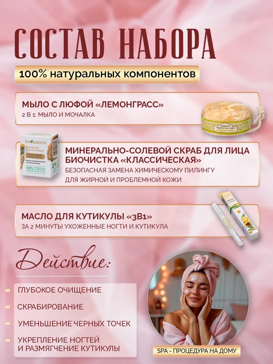 Открыв этот подарочный новогодний деревянный короб, вы насладитесь приятными нотками афродизиака лемонграсса. Все дело в натуральном ароматном мыле с люфой «Лемонграсс». Это мыло прекрасно подходит для глубокого очищения кожи и пор, обеспечивает пенный массаж. Оно отшелушивает ороговевшие клетки, благодаря чему кожа становится мягкой, нежной и бархатистой. Обогащенное эфирным маслом лемонграсса, известного своим тонизирующим действием, мыло с люфой делает кожу более упругой и помогает улучшить её состояние в проблемных местах. Еще в наборе вы найдете Биочистку БиоБьюти «Классическую» — идеальный скраб для ухода за нормальной и жирной кожей. Это косметическое средство состоит из натуральных компонентов. Биочистка очищает поры, устраняет загрязнения и жирный блеск и улучшает цвет лица. Очень важно, что она осуществляет пилинг лица, не повреждая защитный слой кожи, и при этом делает глубокий безопасный детокс. После использования этого нежного эксфолианта кожа становится гладкой, нежной и, что очень важно, нормализуется выработка кожного сала. Это эффективное средство от прыщей. Завершает состав набора масло для кутикулы в карандаше «3 в 1», которое станет незаменимым элементом любого маникюра, способствуя восстановлению ногтевой пластины и увлажнению кутикулы. Удобный аппликатор делает процесс ухода максимально удобным и эффективным. Люди обмениваются подарками, чтобы выразить свою любовь, заботу и внимание родным, друзьям и подругам. Женщинам и девушкам, которые обожают натуральную косметику, будет очень легко угодить с этим подарком. Подарите этот набор от БиоБьюти своим дорогим людям на день рождения, свадьбу, 8 марта или любой другой праздник, и они получат настоящее наслаждение от результата.