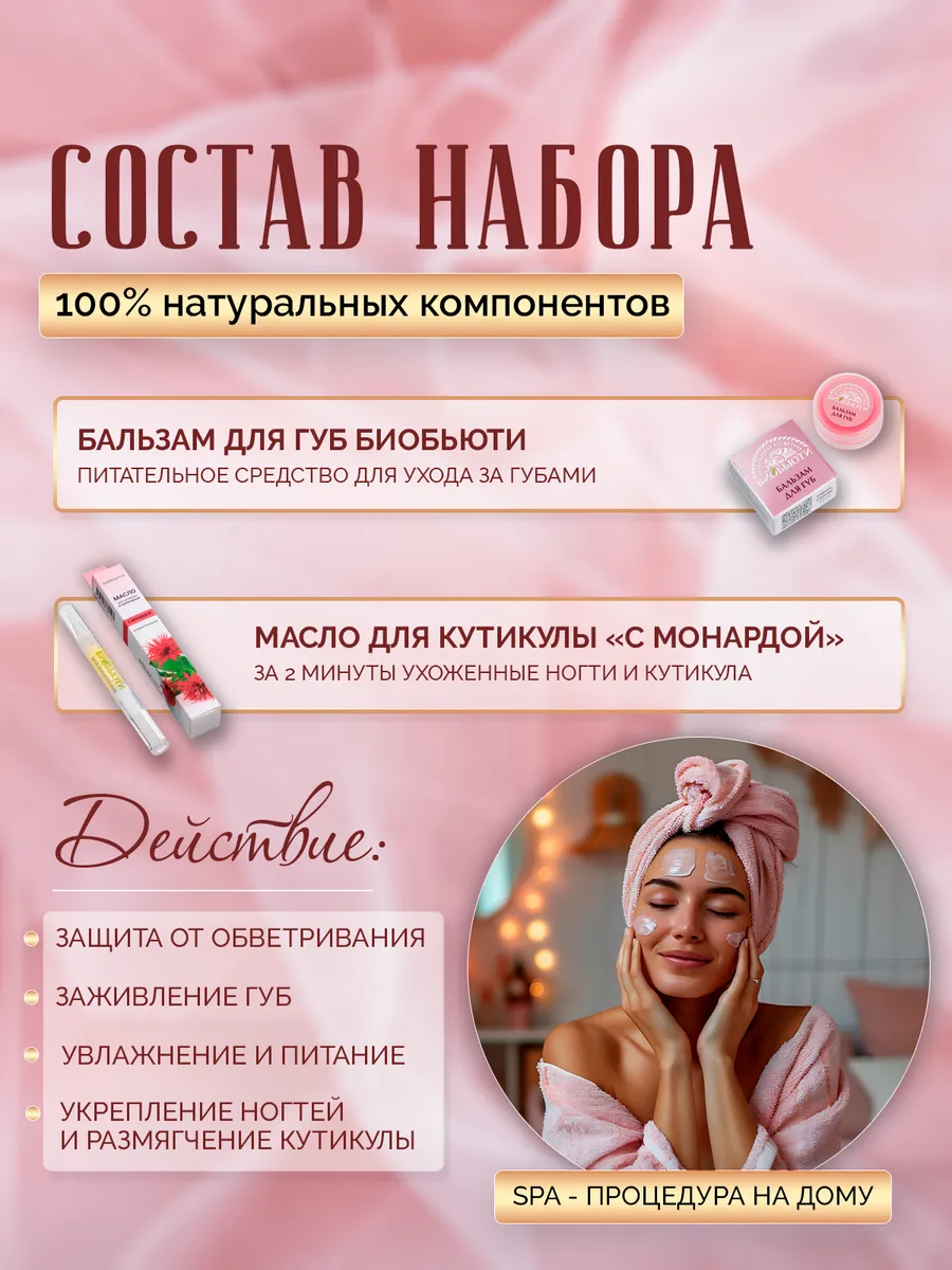 В подарочном наборе «Природная забота» вас ждет натуральное антибактериальное масло для кутикулы в карандаше «С монардой». Полезные масла в составе карандаша питают и предохраняют кутикулу от высыхания, трещин и заусениц. При ежедневном применении в течение нескольких недель кутикула становится мягкой и аккуратной. На ногтях, не покрытых лаком, карандаш выполняет роль маски, укрепляя ногти и защищая их от расслаивания. Насладитесь мятно-лимонным ароматом монарды! Также в наборе еще одно важное средство. Сейчас зима, и кожа губ особенно нуждается в поддержке и заботе. А поможет справиться с этими проблемами натуральный бальзам-блеск для губ. В состав бальзама для губ БиоБьюти входит шикониновое масло, которое является натуральным антибиотиком. Оно бережно снимает воспаление, борется с вирусами и бактериями, не провоцируя аллергических реакций и раздражений. Бальзам содержит пчелиный воск, который спасает губы от пересушивания, создает на коже барьерную пленку. Масла жожоба и абрикосовой косточки смягчают покрасневшую кайму губ и ускоряют заживление микротрещин. Бальзам питает кожу, наполняет ее витаминами и способствует ее омоложению. Люди обмениваются подарками, чтобы выразить свою любовь, заботу и внимание родным, друзьям и подругам. Каждой женщине или девушке хотелось бы получить на день рождения, свадьбу, 8 марта и любой другой праздник что-то очень желанное, и мы надеемся, что волшебная красивая коробочка с новогодними подарками от БиоБьюти будет тем, что нужно!