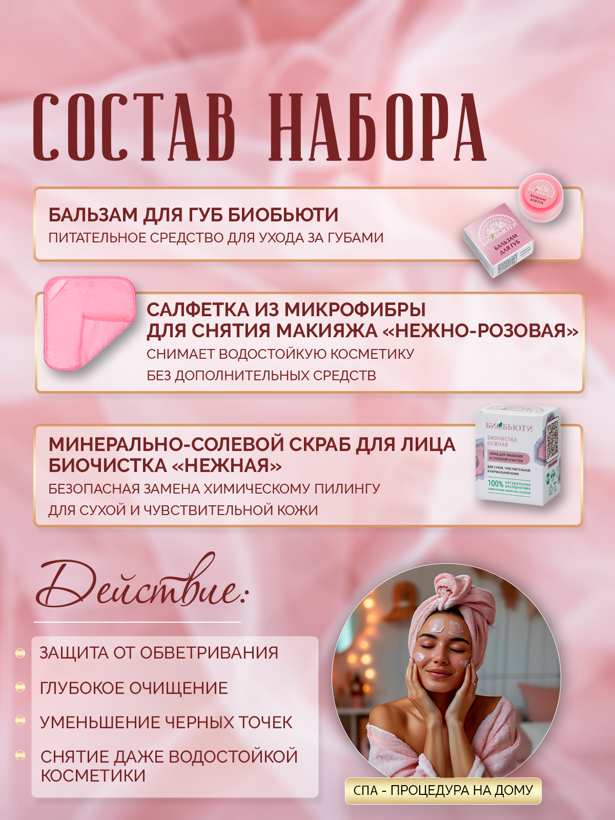 Лучшее восстановление — натуральное и безопасное находится в нашей секретной деревянной коробочке, которая может быть вашим подарком ко дню рождения или выпускному. Внутри вы найдете набор «Натуральное восстановление». Начинается восстановление с Биочистки БиоБьюти «Нежная» —лучшее, что мы можем предложить вам. Всего за 20-30 сек. этот скраб сделает нежнейший пилинг лица, не повреждая защитный слой кожи, мягко очистит кожу от пыли, макияжа и сделает ей детокс( при этом не требуется растирания скраба). Это средство идеально подходит для ухода за сухой и чувствительной кожей. Используйте этот эксфолиант перед нанесением кремов и масок, и вы намного улучшите эффект от ухода. При постоянном применении ваша кожа станет упругой и эластичной и будет выглядеть намного моложе. Также в наборе еще одно важное средство. Кожа губ особенно нуждается в поддержке и заботе. А поможет справиться с этими проблемами натуральный бальзам-блеск для губ БиоБьюти, в составе которого шикониновое масло, которое является натуральным антибиотиком. Оно бережно снимает воспаление, борется с вирусами и бактериями, не провоцируя аллергических реакций и раздражений. Бальзам содержит пчелиный воск, который спасает губы от пересушивания, создает на коже барьерную пленку. Масла смягчают губы и ускоряют заживление микротрещин. Бальзам питает кожу и наполняет ее витаминами. И кульминация набора — нежнейшая и пушистая Салфетка косметическая для умывания и снятия макияжа. Ее поверхность из микроволокна притягивает грязь и удаляет не только излишки кожного жира, но и макияж. Выражайте свою любовь, заботу и внимание родным, друзьям и подругам. Женщинам и девушкам, которые обожают натуральную косметику, будет очень легко угодить с этим подарком. Подарите этот набор от БиоБьюти на свадьбу или к семейному празднику — Дню семьи, любви и верности.