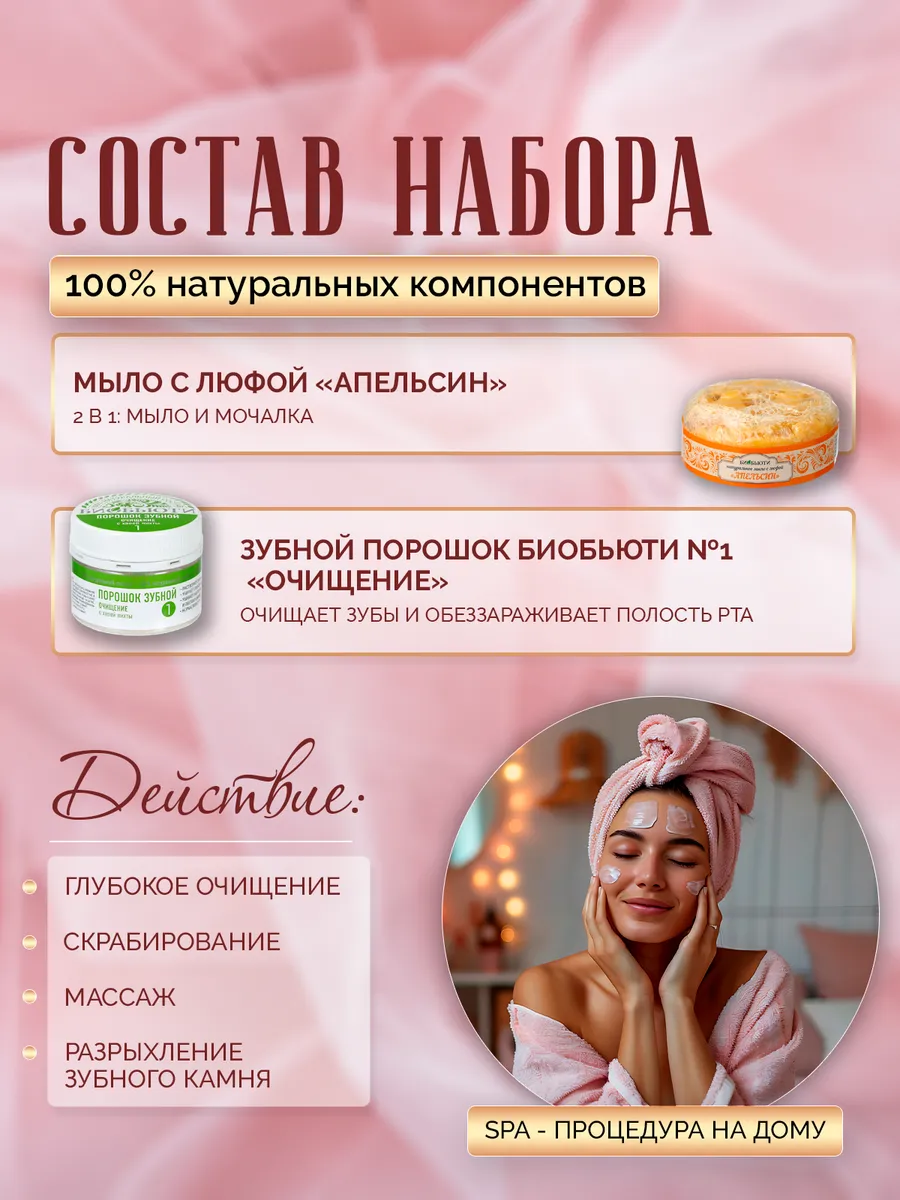 Подарочный набор «Чистота и свежесть» для тех, кто следит за своим здоровьем и кому важно свежее дыхание. Набор упакован в красивый деревянный короб. Внутри мы положили Зубной порошок БиоБьюти «Очищение», который уже давно завоевал свою любовь натуральностью состава и прекрасным эффектом. При использовании порошка зубы становятся крепкими, здоровыми и снижается их чувствительность. Он эффективно очищает полость рта от зубного налета, устраняет бактерии, размягчает зубной камень. Природный состав средства способствует укреплению зубов, снятию воспаления десен и устранению болевых ощущений. Это 100% натуральное средство предназначено для ежедневной чистки зубов. Еще в наборе есть мыло с люфой «Апельсин». С приятными свежими нотками эфирного масла апельсина оно понравится и взрослым, и детям, поднимет настроение и настроит на праздник. Мыло прекрасно подходит для глубокого очищения кожи и пор, обеспечивает пенный массаж. Люфа легко отшелушивает ороговевшие клетки, благодаря чему кожа становится мягкой, нежной и бархатистой. После этого волшебного SPA вы ощутите приятное тонизирующее действие, а кожа станет более упругой. Мыло на веревке удобно использовать в душе или бане, а также брать с собой в путешествия. Подходит для всех типов кожи. Этот набор подойдет не только женщинам или девушкам, но и мужчинам на день рождения, свадьбу, выпускной и другие праздники. Подарочные наборы от БиоБьюти порадуют и вас, и тех, кому вы их подарите. Пусть праздник станет для всех незабываемым!