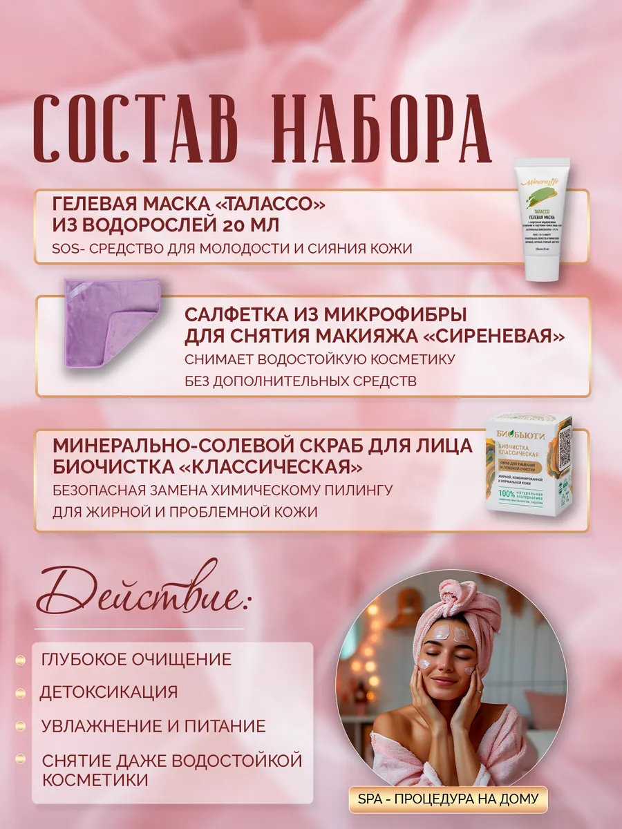 Почему этот набор называется «Природный релакс»? Потому что его обладателя ожидают самые приятные и эффективные этапы в уходе за лицом. Первый этап — очищение кожи Биочисткой БиоБьюти «Классическая». После использования этого нежного эксфолианта кожа становится гладкой, нежной и, что очень важно, нормализуется выработка кожного сала. Натуральные компоненты очищают поры, устраняют загрязнения и улучшают цвет лица. При регулярном применении Биочистка избавляет даже от прыщей. Скраб наносится на кожу в виде мокрого песочка всего на 40-60 секунд и смывается водой, невероятно быстро и эффективно удаляя пыль, макияж и излишнюю жирность, после чего кожа начинает дышать и отдыхать. Второй этап — нанесение Маски «Талассо» Mineralife с морскими водорослями для подтяжки кожи лица и шеи. Если вы куда-то спешите или просто не любите долгие процедуры в ванной, но при этом хотите выглядеть великолепно — примените это SOS-средство. Маска быстро преобразит вашу кожу — добавит ей влаги и питательных веществ. Ощущение после маски, как будто кожа отдохнула и съездила на SPA-курорт. А чем же снять маску и сделать это быстро, безопасно и максимально комфортно? Вот вам и ответ — Салфеткой очищающей из микрофибры БиоБьюти, которая прекрасно подойдет для тех, кто устал от постоянных затрат на мицеллярную воду, молочко для снятия макияжа и тысячи ватных дисков. Ее поверхность из микроволокна притягивает грязь и удаляет не только излишки кожного жира, но и макияж. Этот подарочный