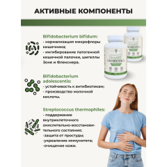 Поддерживает нормальную микрофлору кишечника, улучшает процессы пищеварения, восстанавливает нормальный метаболизм. Содержит витамины группы (В1, В2, В6), лактазу, липазу, лактулозу и специально подобранные семь пробиотических штаммов. В одной капсуле содержится 2,4 млрд бактерий. Комплекс вызывает положительную динамику показателей пищеварения и восстанавливает нормальный состав кишечной микрофлоры. К пользе пробиотиков Вы можете добавить пребиотики, молочные микроорганизмы, витамин С. Благодаря сбалансированному составу и живым бактериям, комплекс мягко воздействует на ЖКТ, устраняя дисбактериоз, вздутие, раздражение и другие последствия нарушения микрофлоры. Bifidobacterium (культура) в составе препятствует развитию патогенных бактерий, Streptococcus (культура) помогает правильному усвоению питательных веществ и контролю аппетита. Витамины B 1 2 6 оказывают дополнительное поддерживающее действие и являются питательной средой для полезных бактерий. Витамин B1 (Тиамин) поддерживает деятельность сердечно-сосудистой и мышечной систем. В2 (Рибофлавин) это здоровье для ногтей и необходимый витамин для волос от выпадения. B6 (Пиридоксин) восстанавливает нервную систему, незаменим для кожи лица. В состав комплекса входят ферменты для пищеварения, лактобактерии и бифидобактерии штаммов АС-1579, В-2353, В-9653, которые препятствуют развитию болезнетворных бактерий, синтезируют комплекс витаминов группы b, что очень полезно для кишечника.