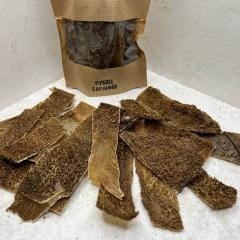 Он отлично усваивается, позволяя животному чувствовать себя здоровым и бодрым. Благодаря неочищенному рубцу, у собаки проявляется хороший мягкий стул, нет проблем с употреблением кала на улице, что довольно часто замечается у собак. У многих собак на подростковом этапе начинают резаться зубки, именно для этого случая необходимо подобрать такое лакомство. Которое не только не повредят зубам собаки, но и позволят укрепить их ещё больше. Удобно хранить и брать с собой. Благодаря крафт-пакету с зип замком.