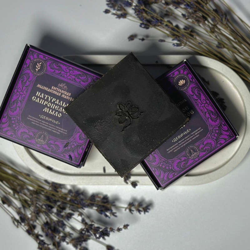 Мыло "Девичье" - это 30% целебного сапропеля с экологически чистого месторождения Костромской области к которому добавлена основа из восьми видов масел таких как : масло ши , касторовое , кокосовое , льняное , горчичное , подсолнечное , пальмовое , оливковое и композиция эфирных масел лаванды.