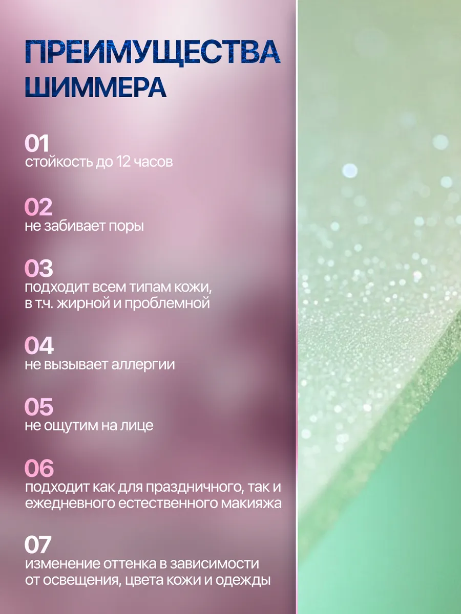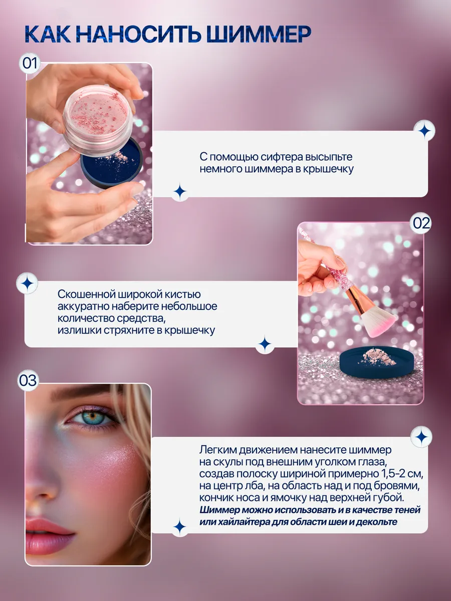 Принцип действия: Минеральный шиммер «Дымчатая роза», благодаря своему нежно розовому оттенку, прекрасно подойдет для светлой кожи, с ним она засияет. Также шиммер можно наносить и на область декольте, чтобы подчеркнуть красоту своих плеч. Благородный оттенок розового цвета придаст Вашему образу неповторимый шарм. Этот шиммер можно использовать и как тени, благодаря этому вы подчеркнете красоту своего цвета глаз. Сейчас очень популярен макияж в стиле nude и именно с минеральным шиммером можно легко и просто несколькими движениями кисти создать легкий, сияющий образ. Придайте коже безупречный и здоровый вид. Помните, что шиммер изменяет свой цвет при разном освещении, а также при сочетании с одеждой, тоном кожи и цветом волос. Это позволит быть вам всегда уникальной и неповторимой.