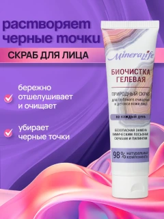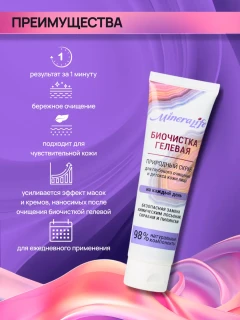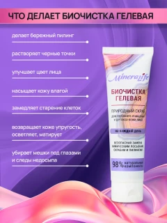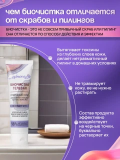 Гелевая Биочистка — это средство, созданное для ухода за сухой и чувствительной кожей. Эффективно помогает избавиться от черных точек. Обеспечивает бережное очищение. Сочетает в себе действия очищающего геля и скраба.