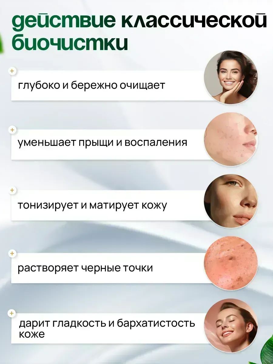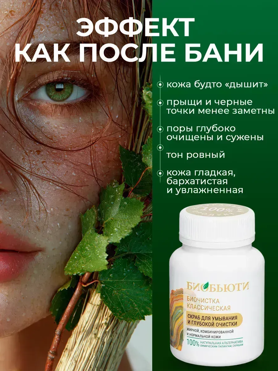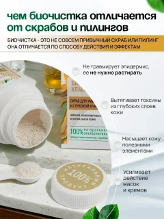 Биочистка — это уникальное средство, разработанное для избавления от прыщей. Это средство эффективно для очищения и сужения пор на лице. Уникальная формула включает в себя мягкие эксфолианты, которые бережно отшелушивают ороговевшие частицы кожи, не травмируя при этом эпидермис. Скраб пилинг для умывания помогает улучшить текстуру кожи, делая её более гладкой и мягкой на ощупь. Кроме того, он способствует улучшению кровообращения, что в свою очередь помогает улучшить цвет лица. Наш скраб для лица не только очищает лицо от черных точек, но и помогает в борьбе с прыщами, предотвращая их появление в будущем. Регулярное применение Биочистки нормализует и работу сальных желез. Продукт подходит для жирной, комбинированной и проблемной кожи. Натуральный сухой скраб предназначен как для взрослых, так и для подростков.