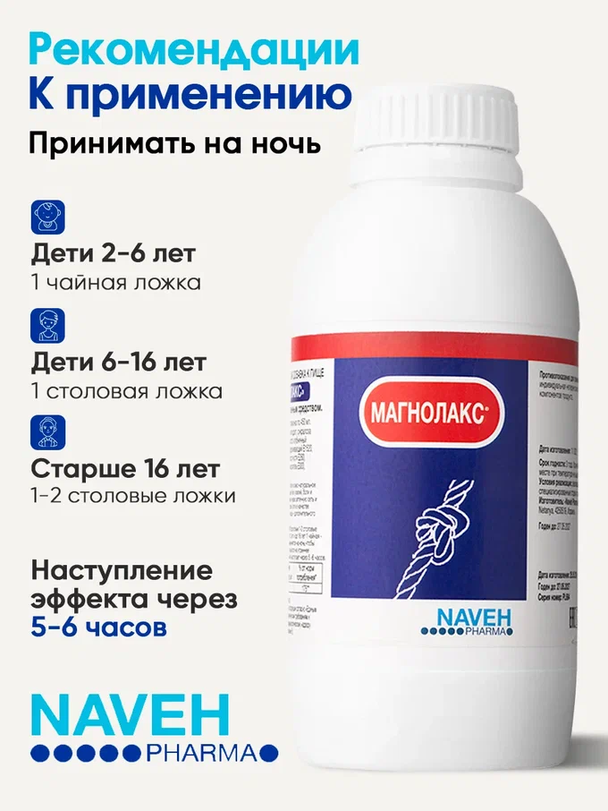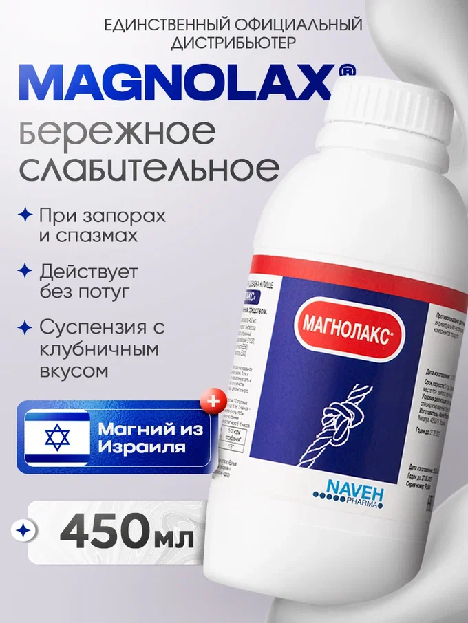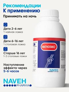 Magnolax — натуральное слабительное на основе ионного морского магния от Naveh Pharma. Мягко и без привыкания решает проблему запора, вздутия и спазмов у взрослых и детей, способствуя очищению кишечника. Подходит для домашнего детокса. Принимается в виде суспензии с фруктовым вкусом на ночь: 1 ч.л. (5 мл) для детей или 1 ст.л. (20 мл) для взрослых.