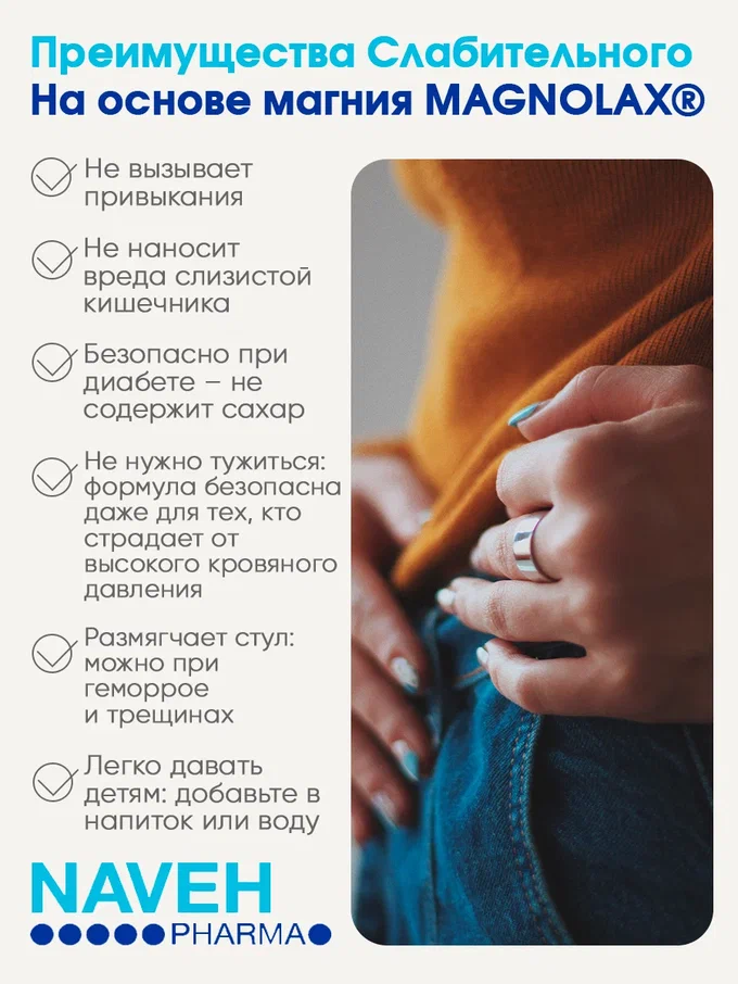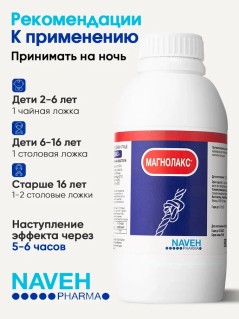 Натуральное мягкое слабительное Magnolax (Магнолакс) от израильской фармацевтической компании Naveh Pharma легко устранит запор у взрослых и детей для быстрого очищения кишечника от токсинов и шлаков. Не повреждает слизистую жкт, избавит от газообразования, предотвратит геморрой и не вызывает привыкания.