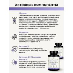 БАД применяется для восстановления поддержания в норме уровня ферритина и гемоглобина, улучшает кроветворение, работу иммунной и нервной систем, при недостатке и повышенной потребности в железе. В данном витаминном комплексе микроэлемент представлен в форме бесглицината. Это форма железа, биодоступность которой приближается к 90–100%. В отличии от солей железа двухвалентного и гидроксида железа трёхвалентного (препараты 1-го и 2-го поколения), бесглицинат железа характеризуется отличной переносимостью. Железо в форме хелата не раздражает слизистую оболочку желудка, не вызывает запоры и тошноту, не окрашивает эмаль зубов, не нарушает всасывание других минералов и питательных веществ, а также в процессе его приёма отсутствует металлический привкус во рту. Входящий в состав витамин С улучшает биодоступность компонентов. Витамин С это транспортировка компонентов железа, защита организма от вирусов и простуд, сильный иммунитет и хорошее настроение. Порошок Хлореллы — источник органического железа (бисглицината). Оказывает выраженное детоксицирующее, противовоспалительное, антибактериальное, противовирусное действие, нормализующее уровень глюкозы в крови. Клеточный сок пихты сибирской содержит каротин, мальтол и целый ряд полезных микроэлементов. Мальтол это сильнейший природный антиоксидант, не дающий свободным радикалам разрушать клетки организма. Улучшает всасываемость и усвоение железа. Фолиевая кислота (витамин В9) поставляет углерод для синтеза железосодержащего протеина в гемоглобине. Вместе с витамином В12 участвует в процессе кроветворения. Укрепляет стенки сосудов и капилляров. Витамин В12 поддерживает метаболизм во всех клетках организма, нормализует работу ЦНС, обеспечивают организм энергией и повышают выносливость. Улучшают сон и концентрацию внимания.