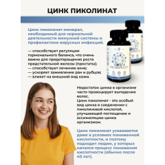 Человеческий организм содержит до 2 г цинка в разных формах соединений. Этот минерал в основном концентрируется в поджелудочной железе, печени, простате и мышцах. А также входит в состав более чем 400 разных ферментов, запускающих десятки реакций обмена веществ и процесса дыхания, превращения и выведения углекислого газа. Он обладает ранозаживляющими и антибактериальными свойствами, благодаря чему эффективно поддерживает здоровье кожи, регулирует деятельность сальных желез, активно участвует в регенерации кожи и способствует скорейшему заживлению ран. Достаточный уровень цинка необходим для поддержания здоровья репродуктивной системы женщин и мужчин и нормальной выработки в организме тестостерона. В одной капсуле содержится 122 мг пиколината цинка (что составляет 167% от среднесуточной потребности человека). Рекомендации по применению: принимать по 1 капсуле 1 раз в день вместе с приёмом пищи. Продолжительность приема - 1 месяц. При необходимости приём можно повторить. Возможны повторные приемы в течение года. Противопоказания: индивидуальная непереносимость компонентов БАД, беременность, кормление грудью. Перед применением рекомендуется проконсультироваться с врачом. Перед применением БАД детьми необходимо проконсультироваться с врачом-педиатром. Состав: микрокристаллическая целлюлоза - носитель, цинка пиколинат, желатиновая капсула (желатин, вода, диоксид титана - носитель), мальтодекстрин.