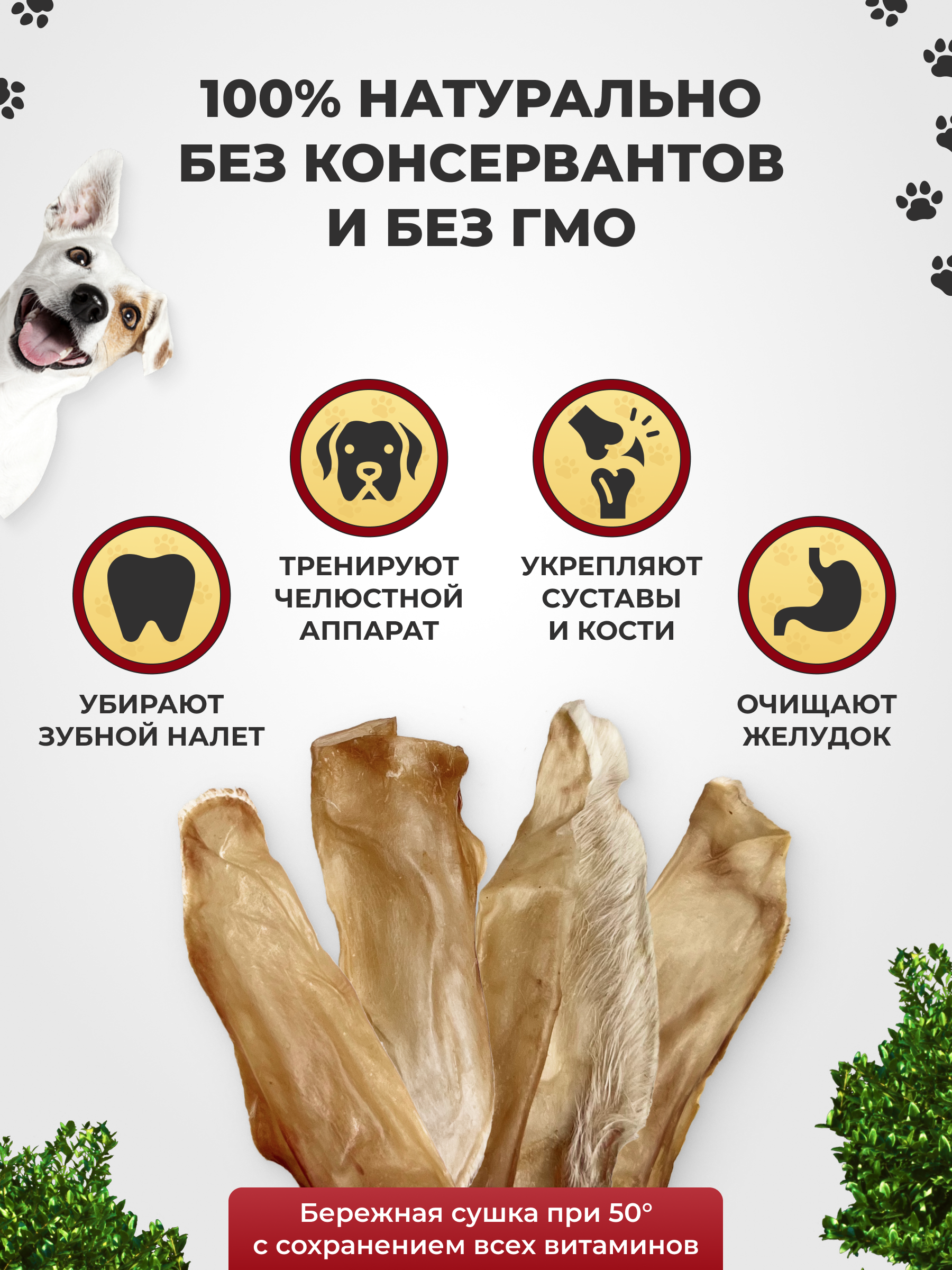 Такое лакомство как уши Кролика обеспечивает следующие эффекты: поддержание гигиены ротовой полости (естественное очищение зубов, десен от налета, зубного камня, остатков пищи); укрепление десен, челюстей за счет удовлетворения жевательной потребности; положительное воздействие на пищеварение, процессы метаболизма; снабжение организма натуральными белками животного происхождения; возможность повышения результативности тренировок при угощении вкусностями за выполненные команды. Многие рекомендуют подсушенные уши кролика для подкормки щенков. Размер лакомства идеален для растущих питомцев. Кроличьи ушки подходят в качестве пустышки или «тренажера», способствующего формированию правильного развития челюстей и прикуса.