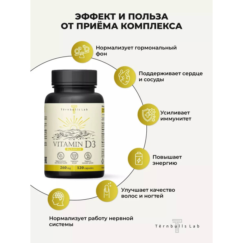 Витамин Д3 5000 МЕ от Ternbulls Lab — это высококачественный источник витамина Д3 в капсулах. D3 - это один из ключевых витаминов, необходимых для поддержания здоровья организма. Витамин d3 поддерживает костную и мышечную системы, способствуя усвоению кальция и фосфора и улучшая эластичность и координацию мышц.