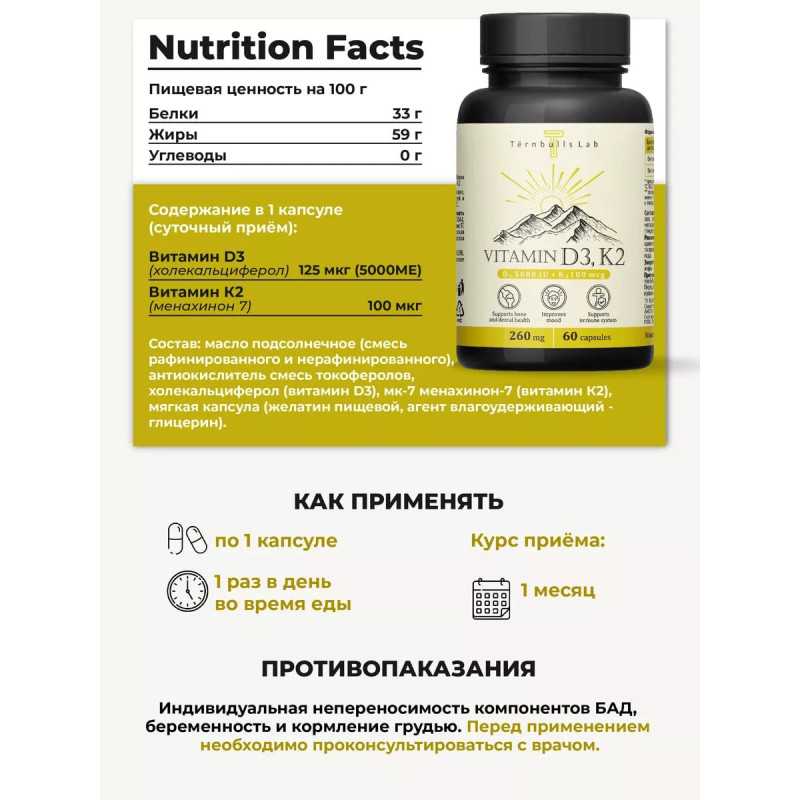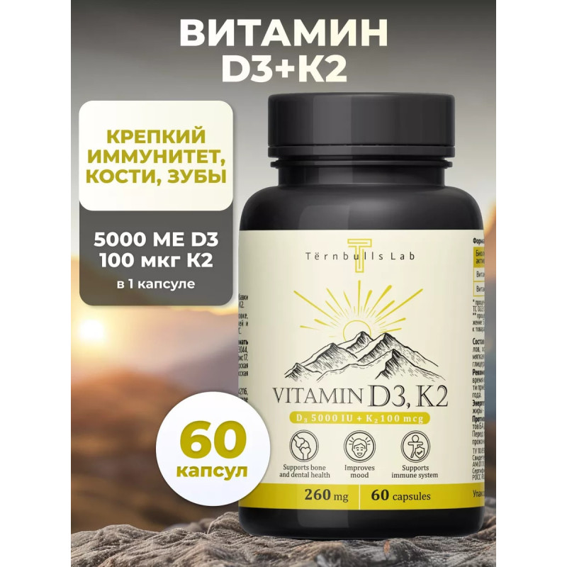 Комплекс Д3К2 от Ternbulls Lab — это высококачественный источник витамина Д3 - 5000 МЕ (холекальциферол) и К2 - 100 мкг (менахинон-7) в капсулах. Витамин D3 K2 - это мощная комбинация питательных веществ, которая обеспечивает целый ряд преимуществ для здоровья. Эти два витамина работают вместе для поддержания здоровья костей, иммунной функции, здоровья сердечно-сосудистой системы и многого другого.