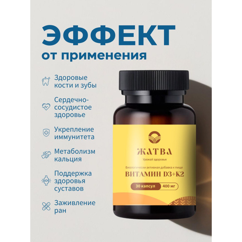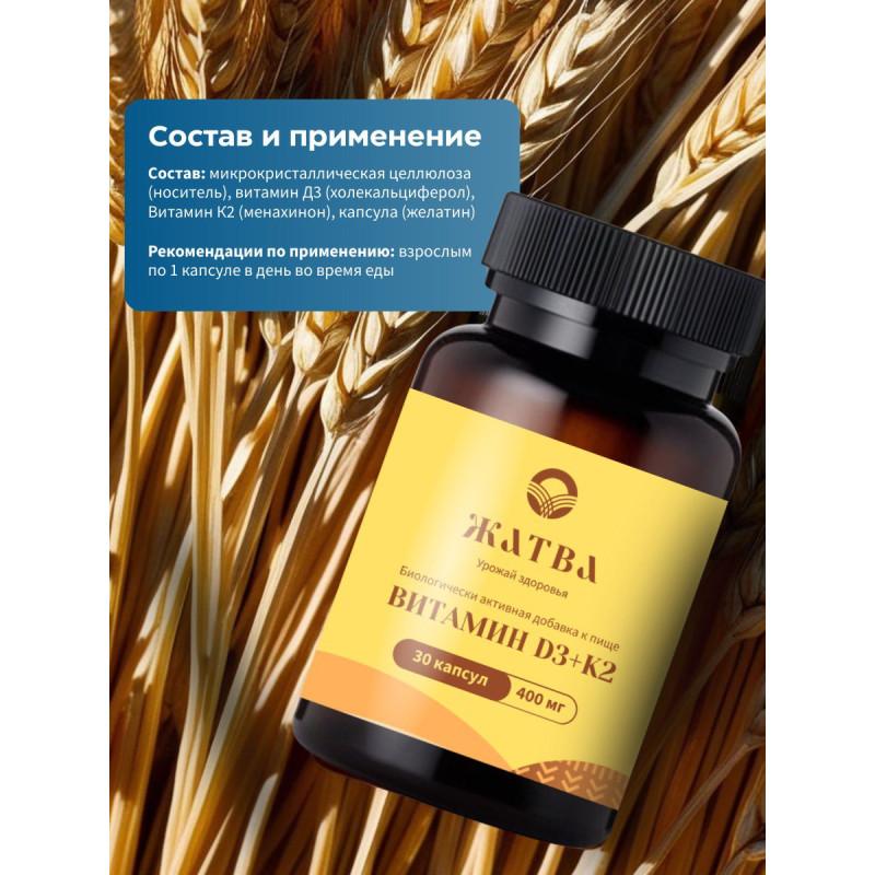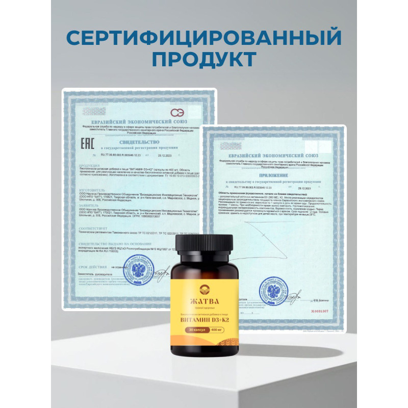 Витаминный комплекс D3+K2 Капсулы Витамин Д3 для иммунитета Кальций для здоровья костей и зубов БАД ЖАТВА 400 мг 30 шт