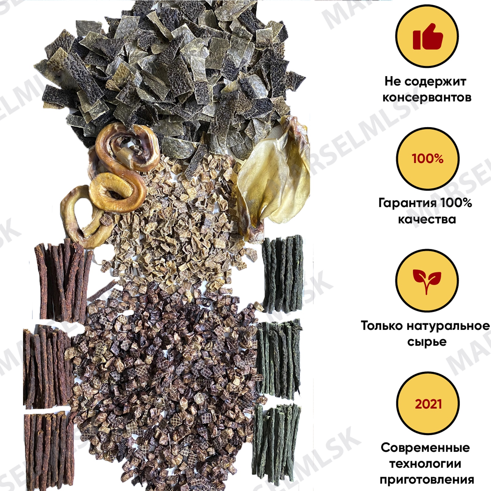 •Вымя 300гр •Легкое говяжье 300гр •Колбаски Оленина с анчоусом 300гр •Колбаски бататом и стручковой фасолью 300гр •Рубец барана 200гр •Ватрушка 2шт •Уши гов 2шт