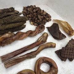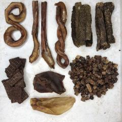 Бычий корень прямой- 2 шт. 22-25см Бычий корень ватрушка XL 1 шт Бычий корень косичка 1шт Пикальное мясо (мясо пищевода) 100гр Рубец говяжий 100гр Легкое говяжье 100гр Губы (Чипсы из носа) 1уп 2шт Ухо говяжье 1шт Говяжьи чипсы 100гр
