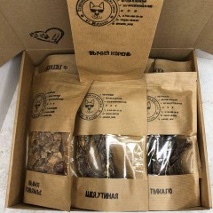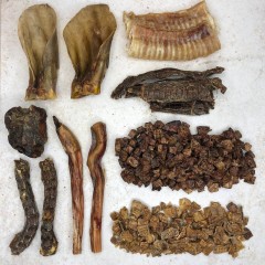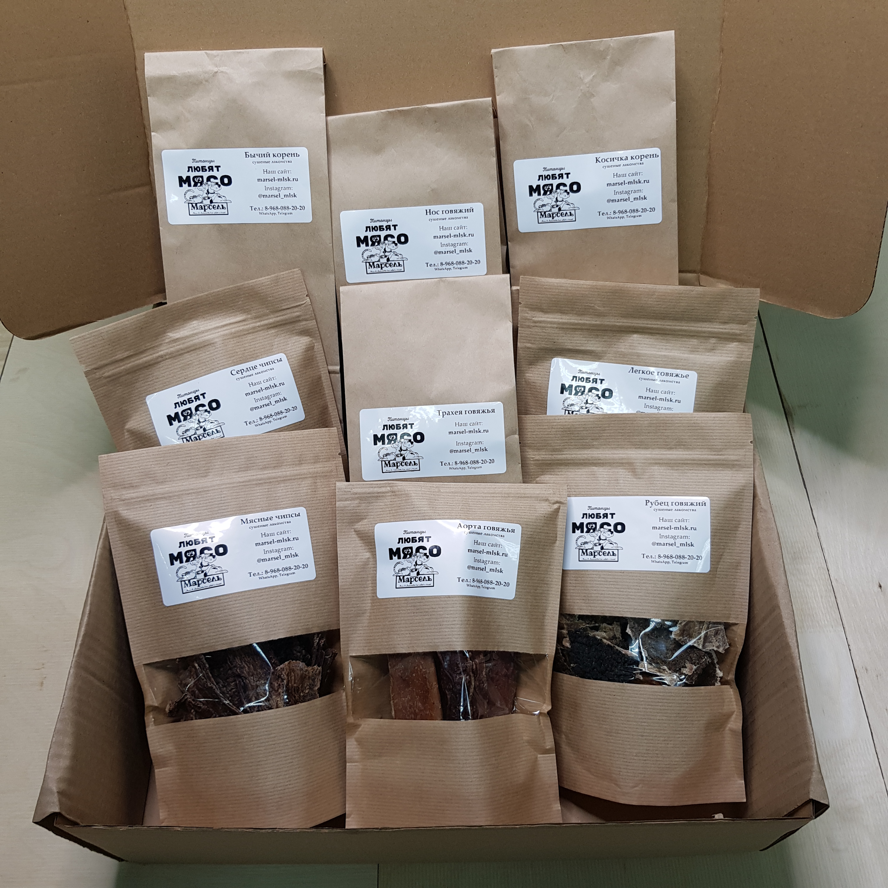 Трахея говяжья 2 шт. 13 - 15 см Бычий корень прямой 2шт 22-25см Калтык говяжий 1 шт Уши говяжьи 2шт Шеи утиные 2шт Пикало ( мясо пищевода ) 100гр Вымя говяжье 100гр Легкое говяжье 100гр