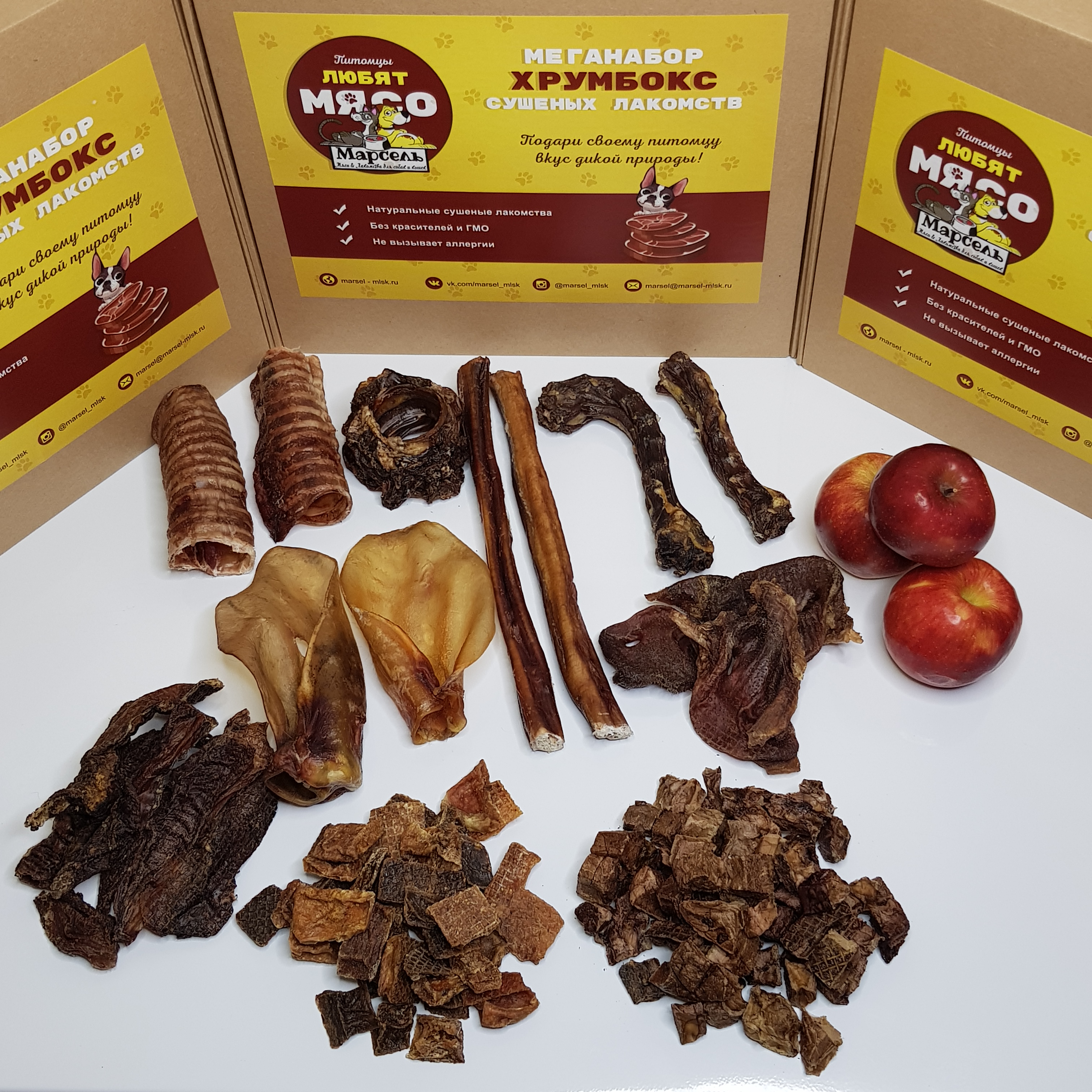 Вашему вниманию представляем меганаборы ХрумБокс - набор полезных лакомств для Вашего питомца. Выгода и удобство для Вас, польза и вкус для Вашего питомца. В составе наборов - исключительно натуральные продукты без добавок и усилителей вкуса. Идеально подходит для Хозяев кто хочет отвлечь своих любимцев на долгое время благодаря бычьему корню, носу говяжьему, и конечно же в составе набора чипсы для поощрения или для дрессировки своего четвероногого. Пакет с застежкой Zip-Lock - продукт сохраняет свежесть и аромат, его удобно хранить и брать с собой в путешествия и на прогулки. В любой момент Вы сможете поощрить питомца вкусным лакомством. Каждый из вас может собрать свой ХрумБокс написав нам в чате или в инстаграме, с радостью соберем для вас персональный ХрумБокс с учетом всех ваших пожеланий, только не забываем, что минимальная сумма заказа 1190 р. Доставка ТК по всей России. Звони и заказывай!