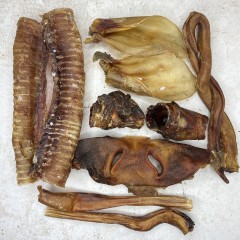 Трахея говяжья длинная 2 шт Бычий корень – 22-25см 2 шт Калтык говяжий 2 шт Уши говяжьи 2 шт Нос говяжий 1 шт Косичка от 20см 1 шт