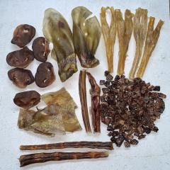 Хвостов те что на фото нет. Вместо них доп ухо говяжье. Утиная шея 3шт Уши говяжьи 3шт Лопаточный хрящ кусочки 1уп Ахиллесова жилка ассорти 100гр Бычий корень 2шт 15-17см Легкое говяжье 100гр