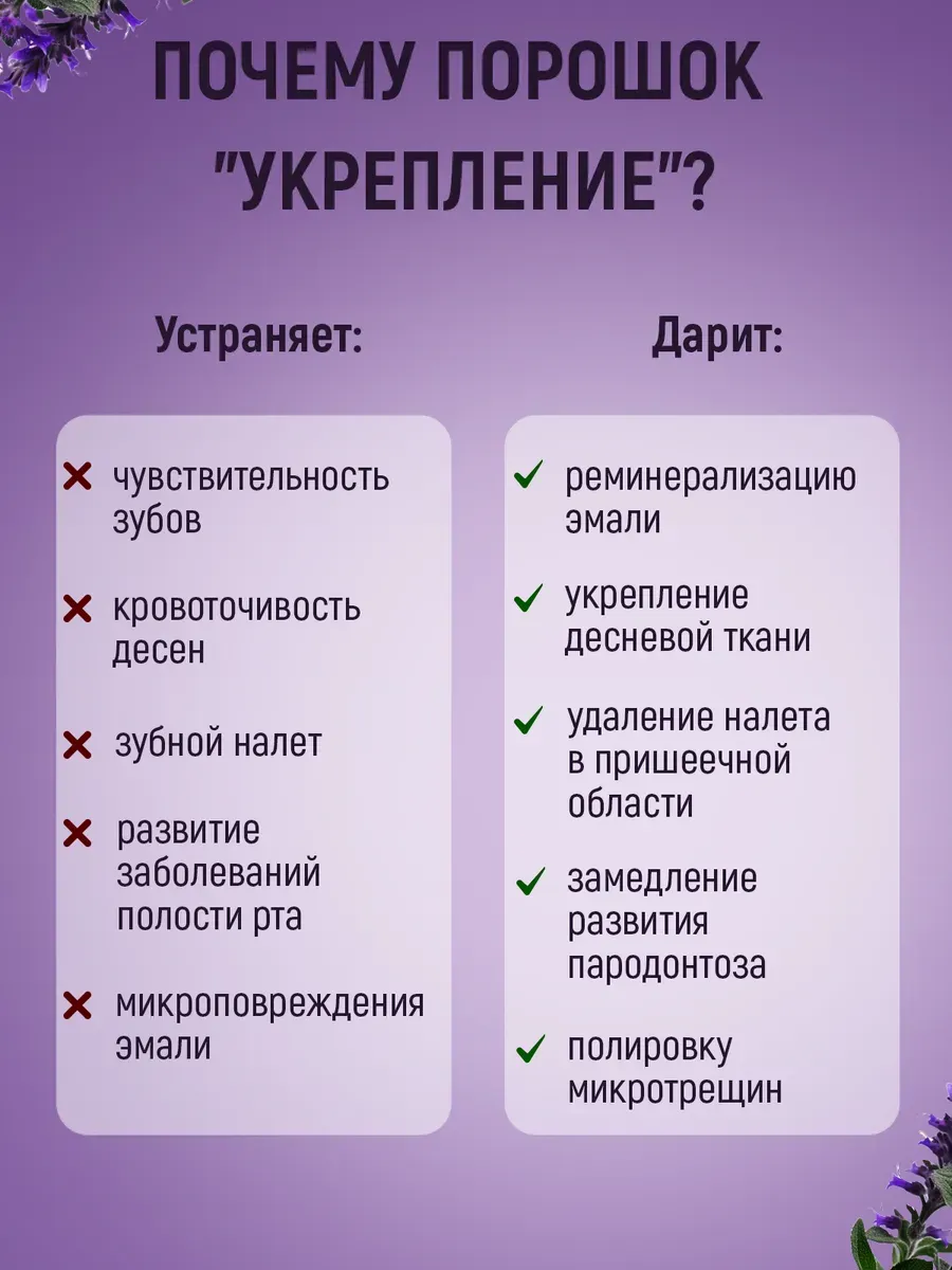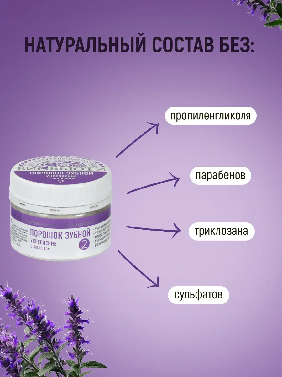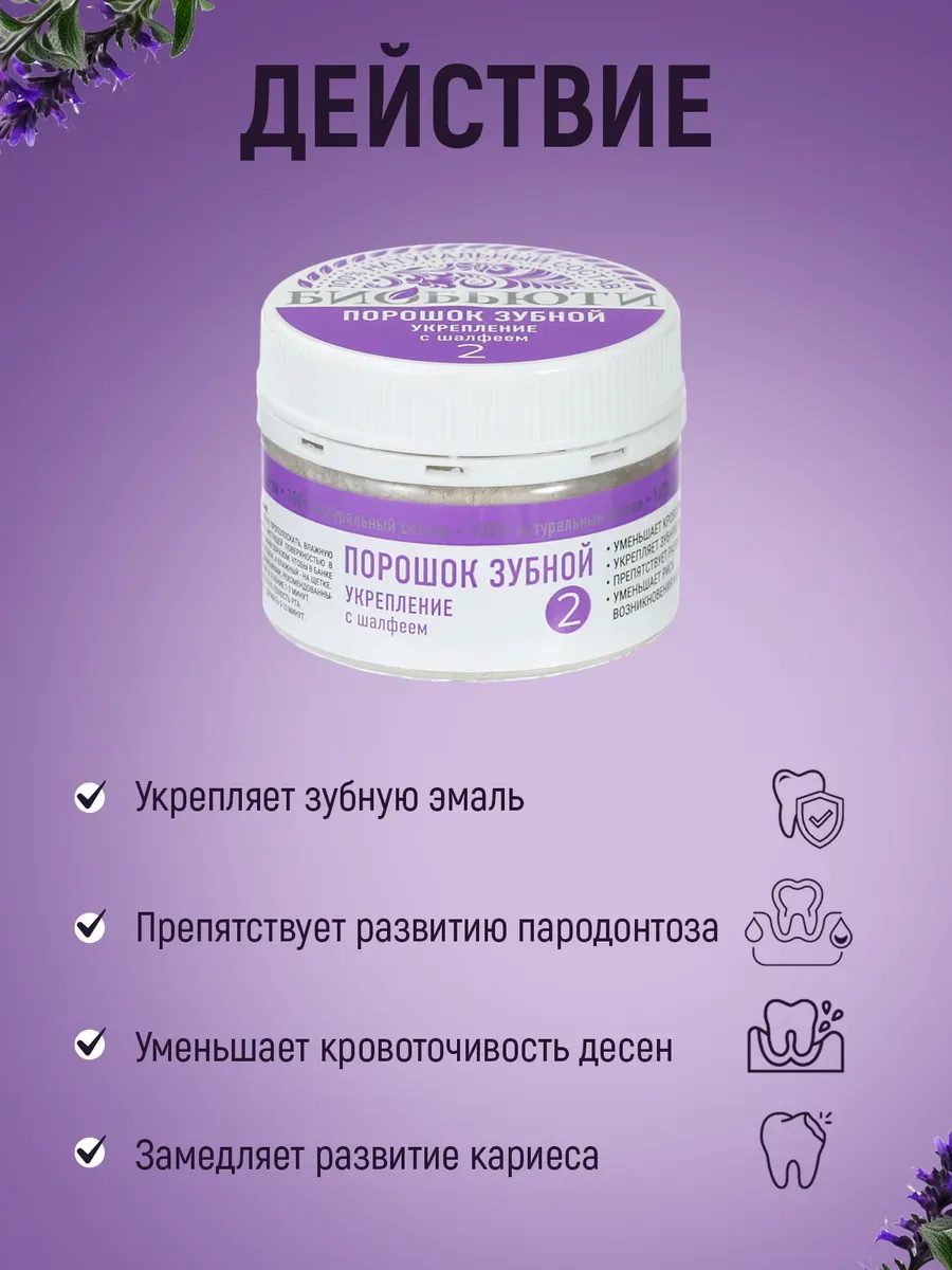 Зубной порошок «Укрепление» с шалфеем предназначен для укрепления эмали и уменьшения кровоточивости десен, он подходит для ежедневного ухода за полостью рта..