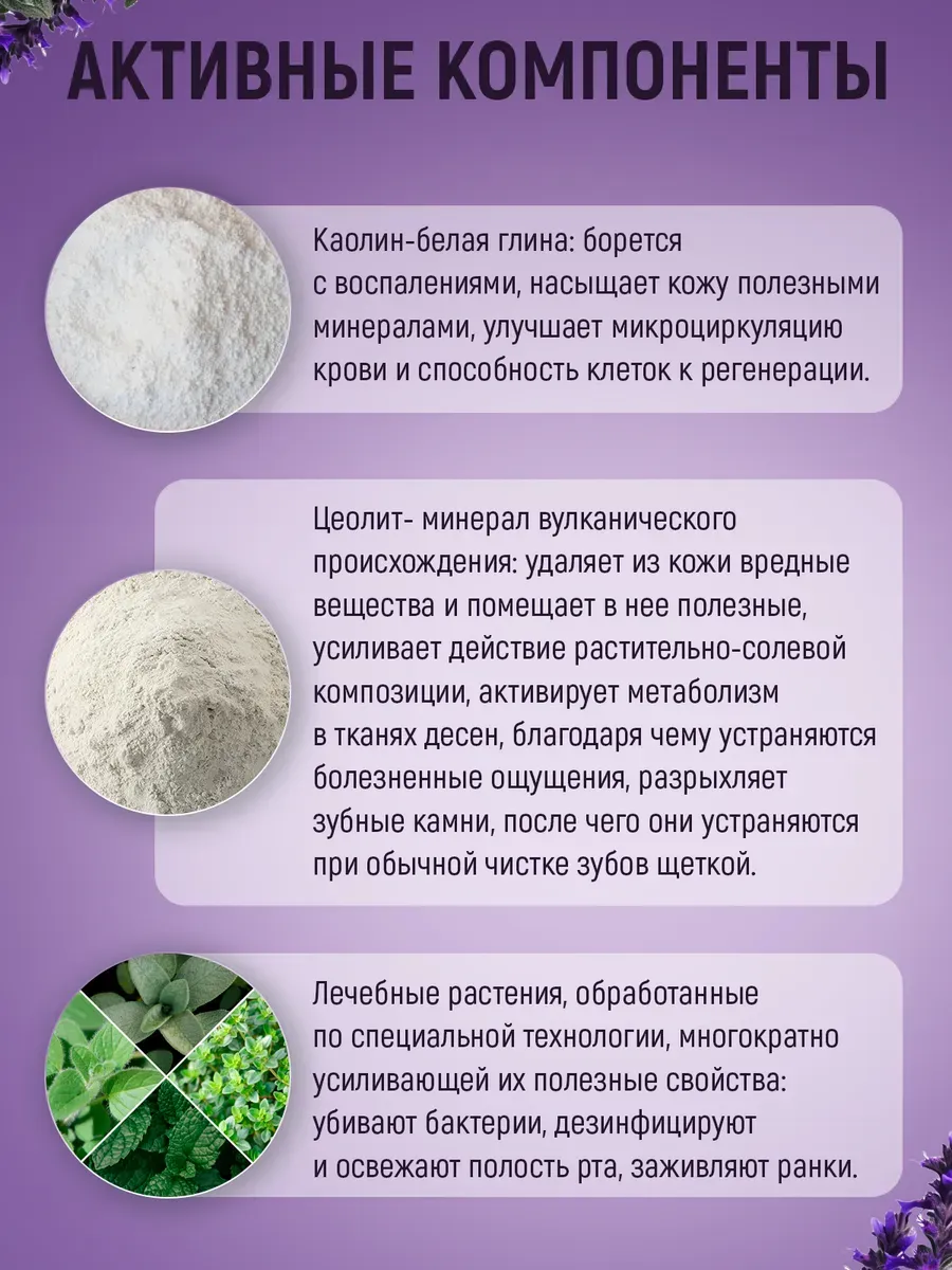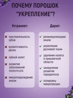 Наш натуральный зубной порошок отлично очищает, устраняет налет, препятствует развитию пародонтоза, пародонтита и гингивита. Данное средство размягчает зубной камень, который впоследствии удаляется зубной щеткой или зубочисткой. Обеззараживает, обезболивает полость рта после лечения и удаления зуба.