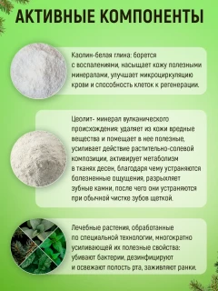 В составе порошка входит вулканический минерал цеолит, который разрыхляет зубные камни, после чего они устраняются при обычной чистке зубов щеткой. Цеолит активирует метаболизм в тканях десен, благодаря чему устраняются болезненные ощущения, в частности после лечения и протезирования зубов.
