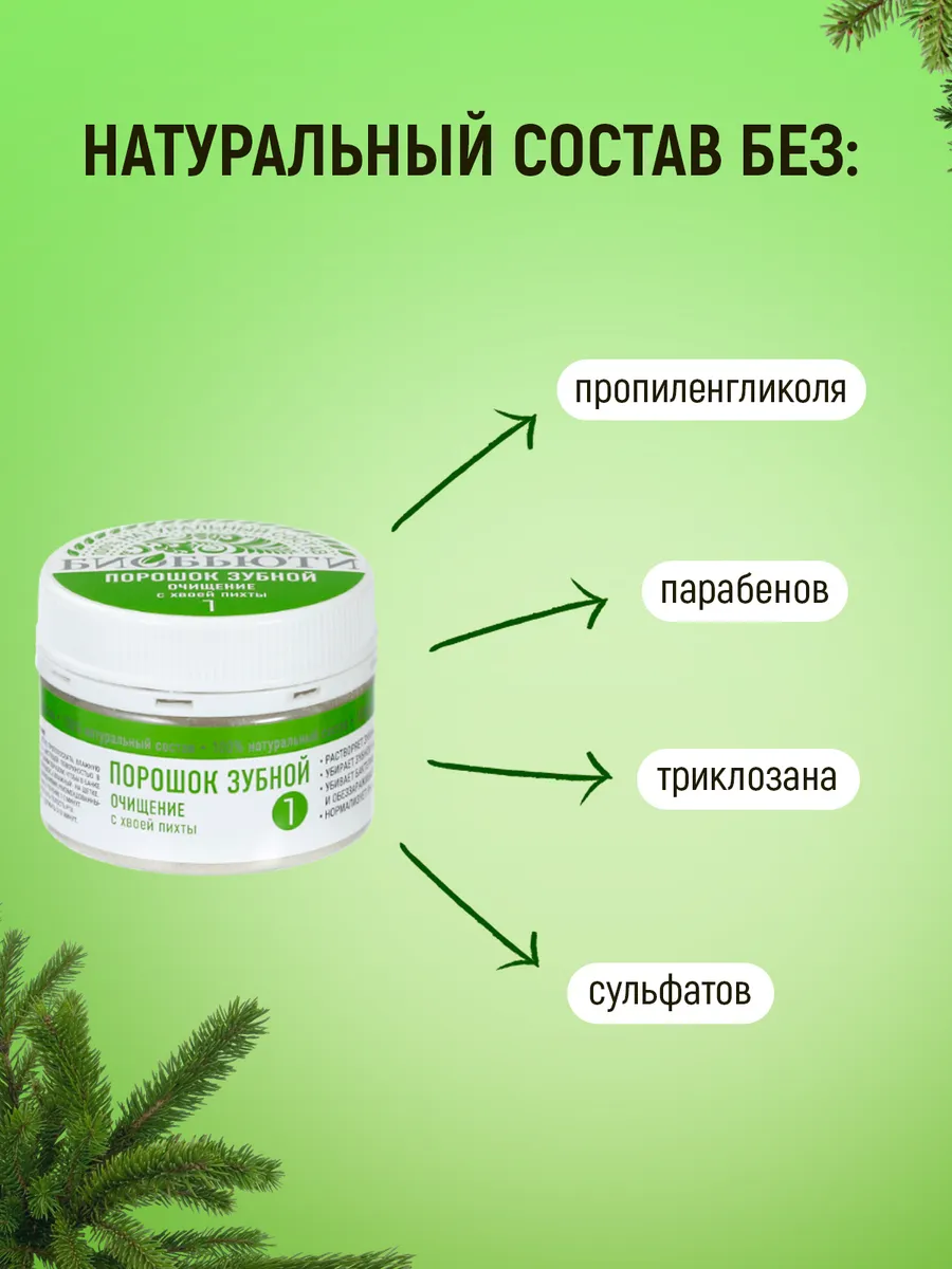 Зубной порошок «Очищение» с хвоей пихты имеет мягкую текстуру и свежий аромат.